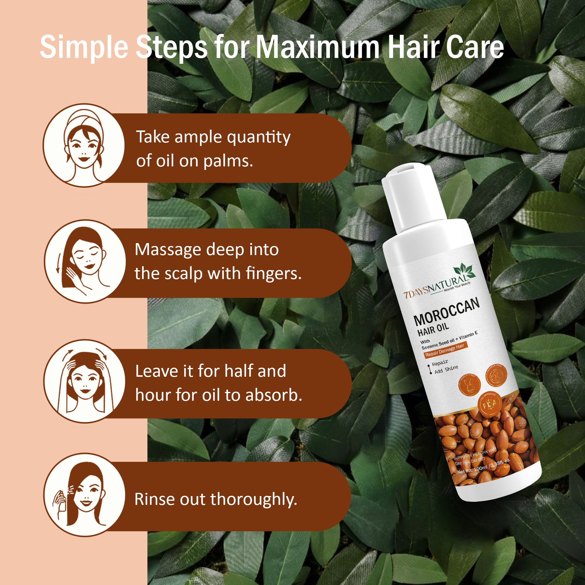 For Skin: Warm a few drops of "7 Days Moroccan Oil" between your palms and gently press onto your face and neck in the morning and evening after cleansing for radiant, hydrated skin.