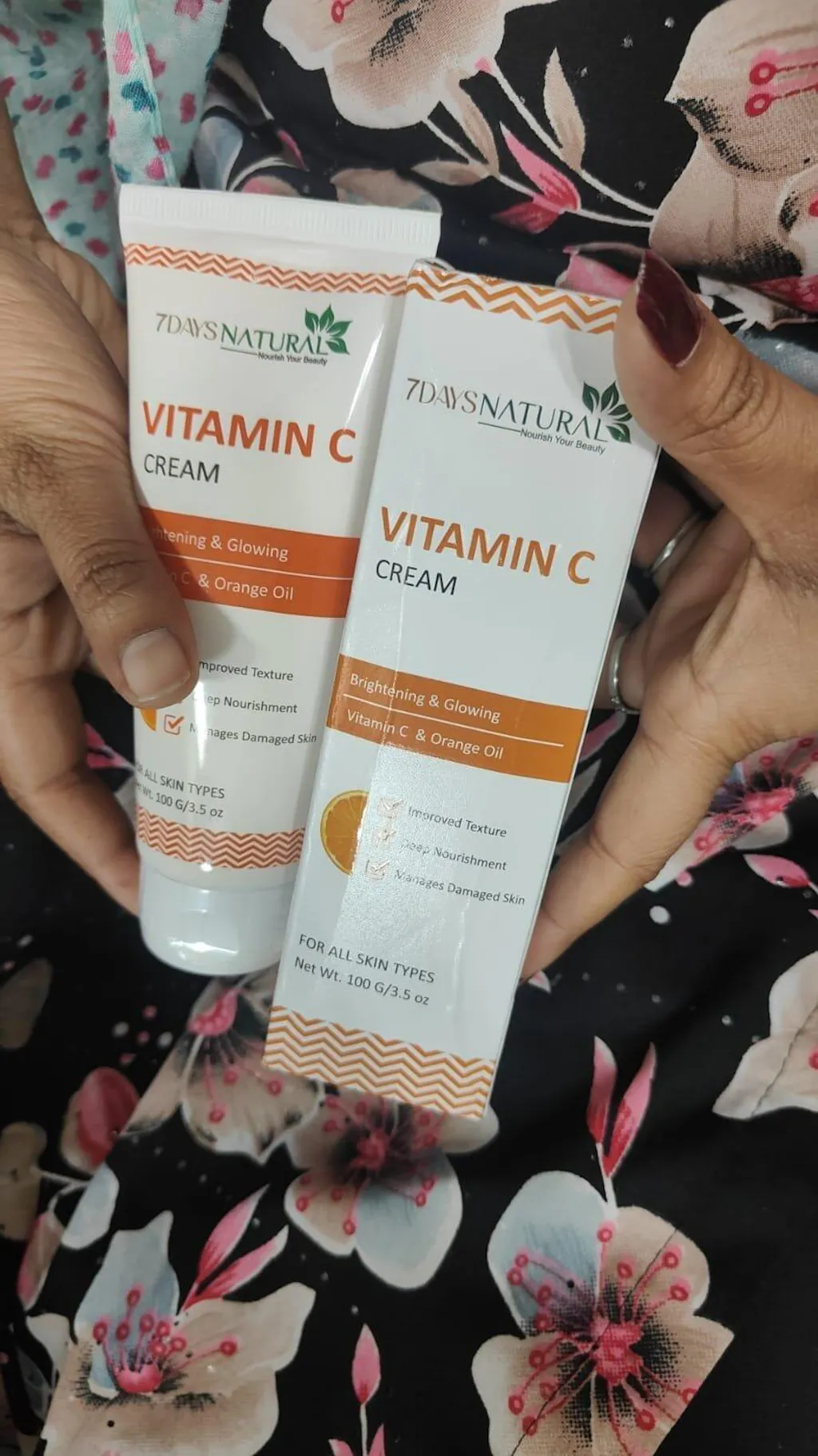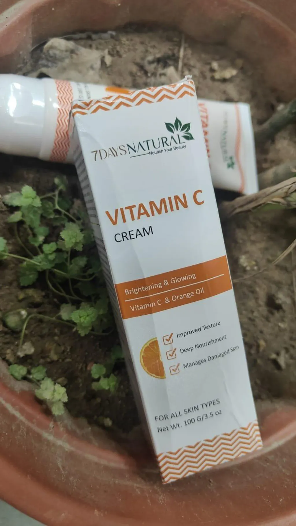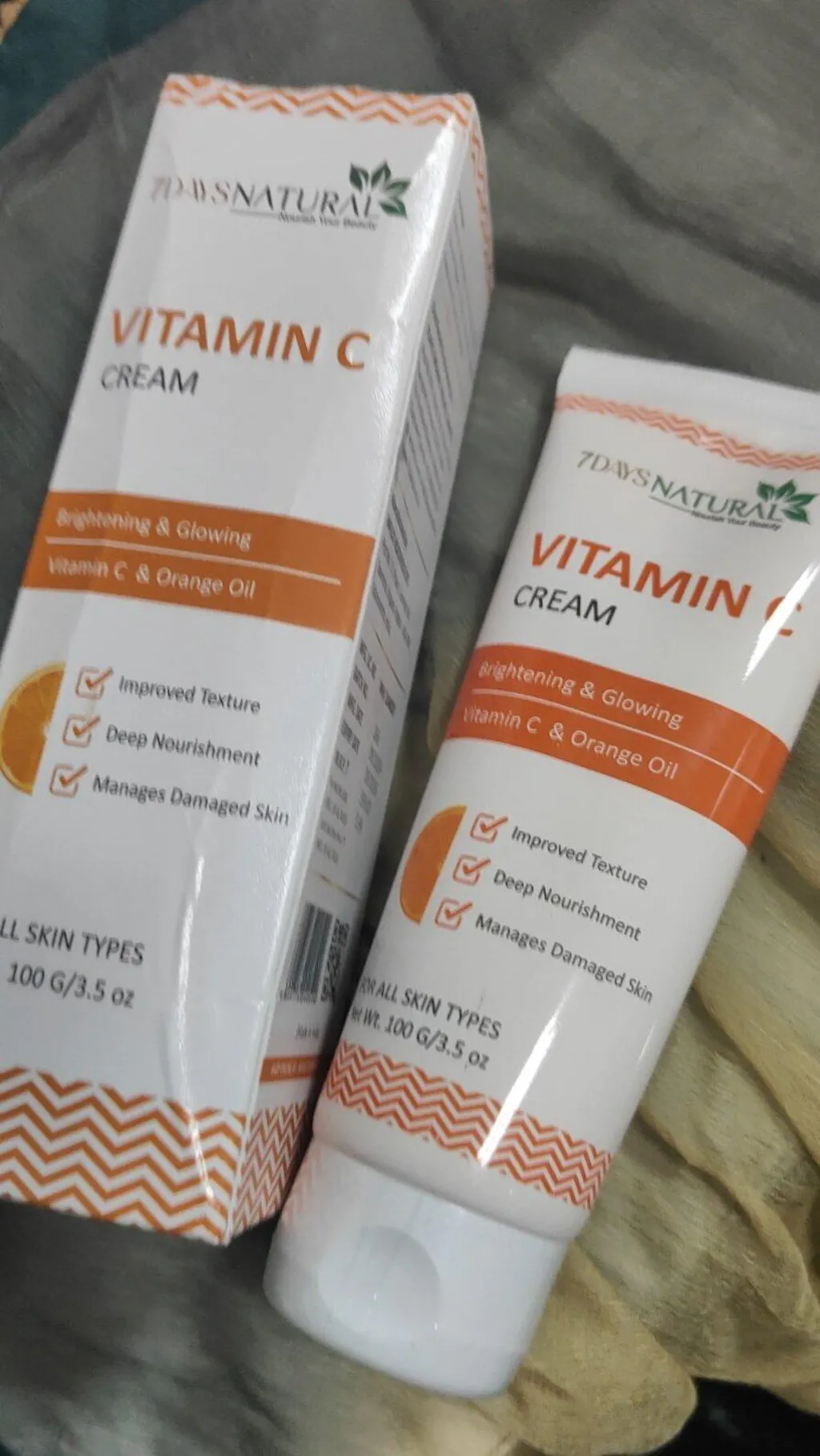 Introducing brand new face cream by 7 Days Natural  -  Vitamin C Face Cream." Crafted meticulously, this cream addresses several skin issues like - Reduces Dark Spot, Evens Skin Tone, Fades Acne Scars, Brightness Skin. This is the ultimate solution for anti-aging protection. Infused with a powerful blend of natural ingredients like orange oil, a potent source of vitamin C that makes skin clear, refreshed and visibly radiant. Presence of vitamin E soothes skin from sun damage, nourishes and protects from free radical damage